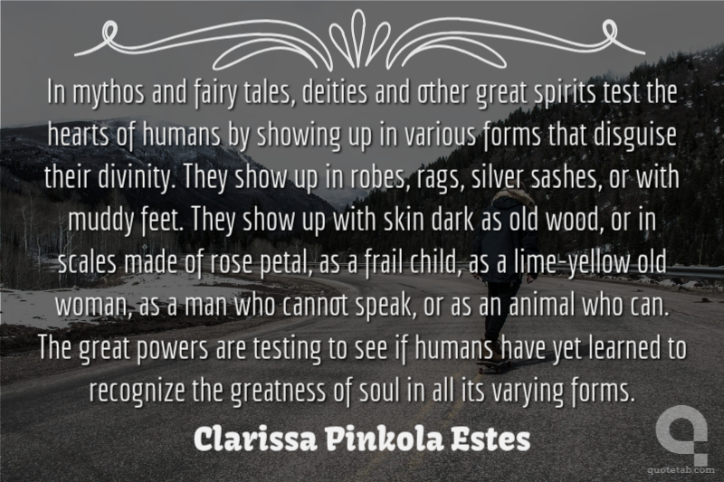 In mythos and fairy tales, deities and other great spirits test the hearts of humans by showing up in various forms that disguise their divinity. They show up in robes, rags, silver sashes, or with muddy feet. They show up with skin dark as old wood, or in scales made of rose petal, as a frail child, as a lime-yellow old woman, as a man who cannot speak, or as an animal who can. The great powers are testing to see if humans have yet learned to recognize the greatness of soul in all its varying forms.