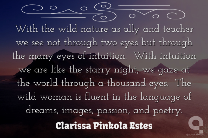 With the wild nature as ally and teacher we see not through two eyes but through the many eyes of intuition. With intuition we are like the starry night, we gaze at the world through a thousand eyes. The wild woman is fluent in the language of dreams, images, passion, and poetry.