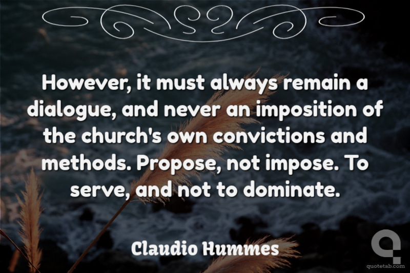 However, it must always remain a dialogue, and never an imposition of the church's own convictions and methods. Propose, not impose. To serve, and not to dominate.