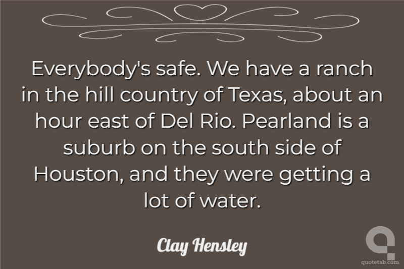 Everybody's safe. We have a ranch in the hill country of Texas, about an hour east of Del Rio. Pearland is a suburb on the south side of Houston, and they were getting a lot of water.
