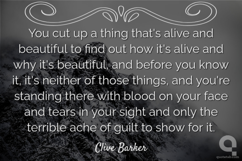 You cut up a thing that's alive and beautiful to find out how it's alive and why it's beautiful, and before you know it, it's neither of those things, and you're standing there with blood on your face and tears in your sight and only the terrible ache of guilt to show for it.