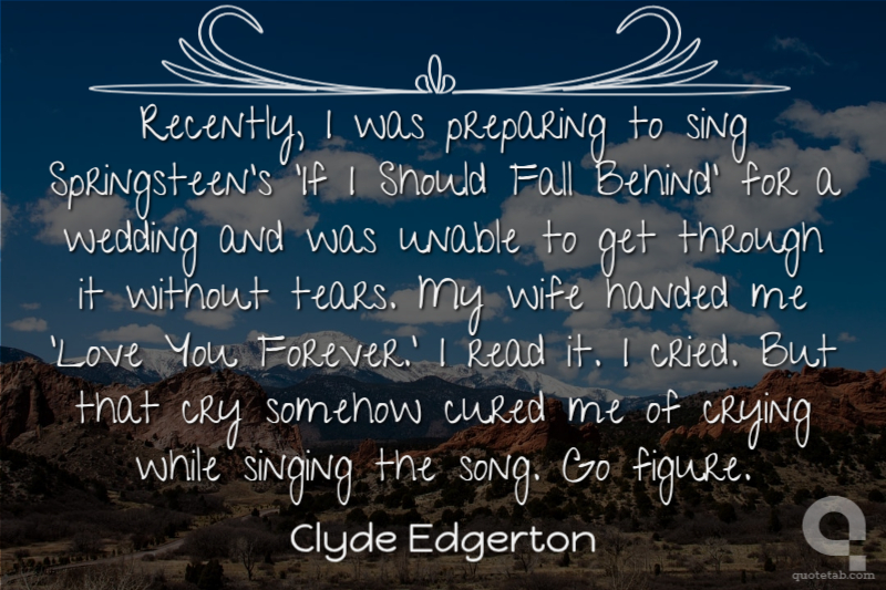 Recently, I was preparing to sing Springsteen's 'If I Should Fall Behind' for a wedding and was unable to get through it without tears. My wife handed me 'Love You Forever.' I read it. I cried. But that cry somehow cured me of crying while singing the song. Go figure.