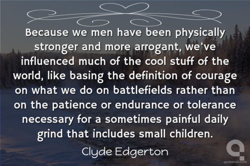 Because we men have been physically stronger and more arrogant, we've influenced much of the cool stuff of the world, like basing the definition of courage on what we do on battlefields rather than on the patience or endurance or tolerance necessary for a sometimes painful daily grind that includes small children.