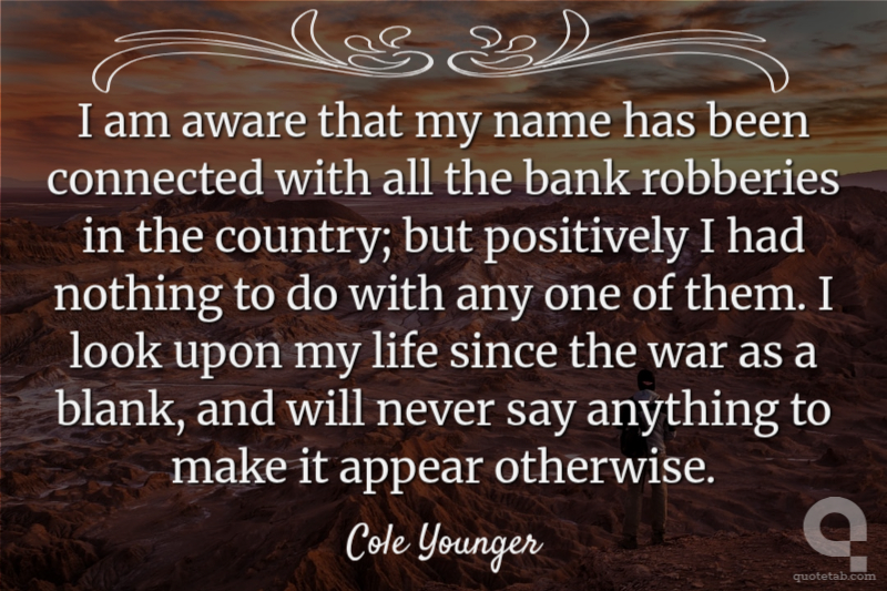 I am aware that my name has been connected with all the bank robberies in the country; but positively I had nothing to do with any one of them. I look upon my life since the war as a blank, and will never say anything to make it appear otherwise.