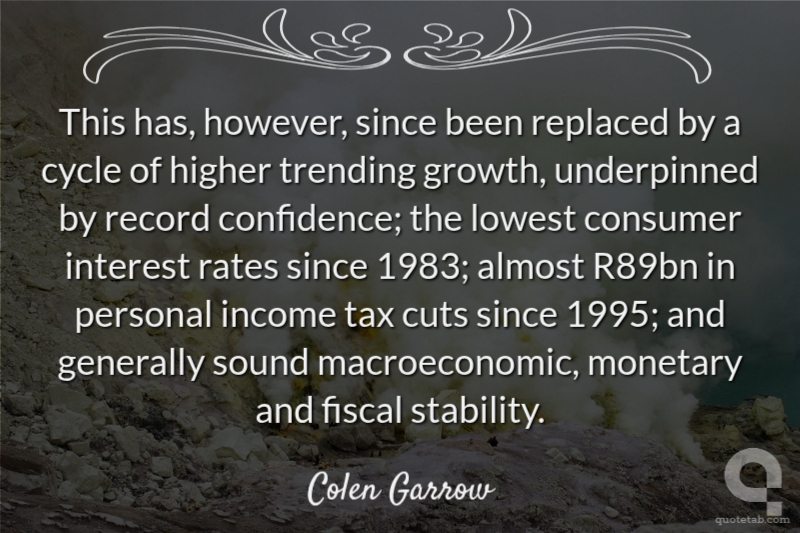 This has, however, since been replaced by a cycle of higher trending growth, underpinned by record confidence; the lowest consumer interest rates since 1983; almost R89bn in personal income tax cuts since 1995; and generally sound macroeconomic, monetary and fiscal stability.