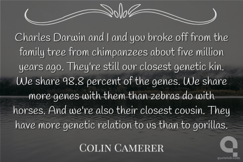 Charles Darwin and I and you broke off from the family tree from chimpanzees about five million years ago. They're still our closest genetic kin. We share 98.8 percent of the genes. We share more genes with them than zebras do with horses. And we're also their closest cousin. They have more genetic relation to us than to gorillas.