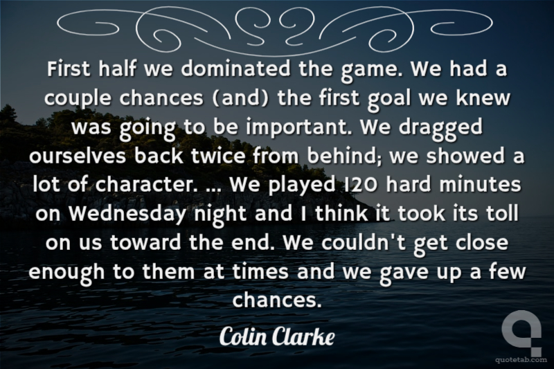 First half we dominated the game. We had a couple chances (and) the first goal we knew was going to be important. We dragged ourselves back twice from behind; we showed a lot of character. ... We played 120 hard minutes on Wednesday night and I think it took its toll on us toward the end. We couldn't get close enough to them at times and we gave up a few chances.