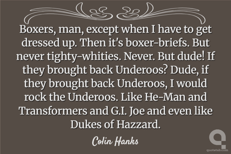 Boxers, man, except when I have to get dressed up. Then it's boxer-briefs. But never tighty-whities. Never. But dude! If they brought back Underoos? Dude, if they brought back Underoos, I would rock the Underoos. Like He-Man and Transformers and G.I. Joe and even like Dukes of Hazzard.