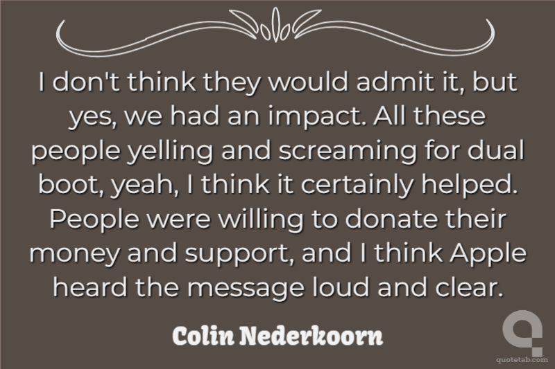 I don't think they would admit it, but yes, we had an impact. All these people yelling and screaming for dual boot, yeah, I think it certainly helped. People were willing to donate their money and support, and I think Apple heard the message loud and clear.