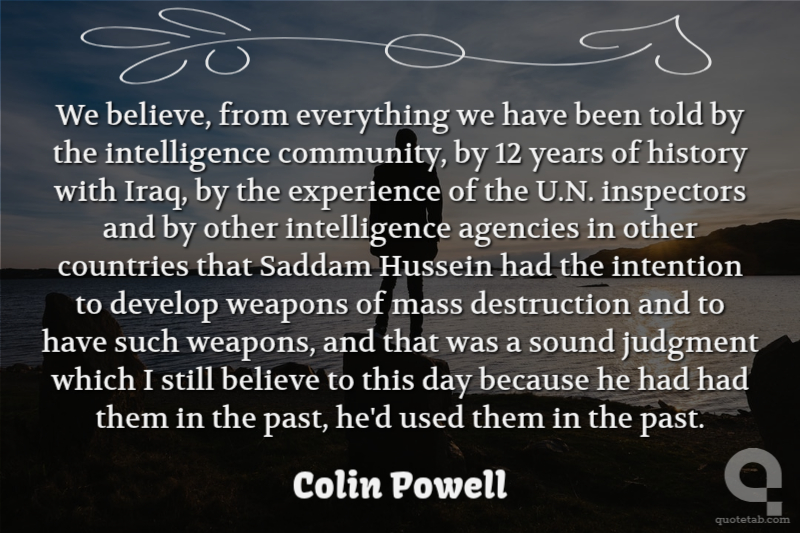 We believe, from everything we have been told by the intelligence community, by 12 years of history with Iraq, by the experience of the U.N. inspectors and by other intelligence agencies in other countries that Saddam Hussein had the intention to develop weapons of mass destruction and to have such weapons, and that was a sound judgment which I still believe to this day because he had had them in the past, he'd used them in the past.