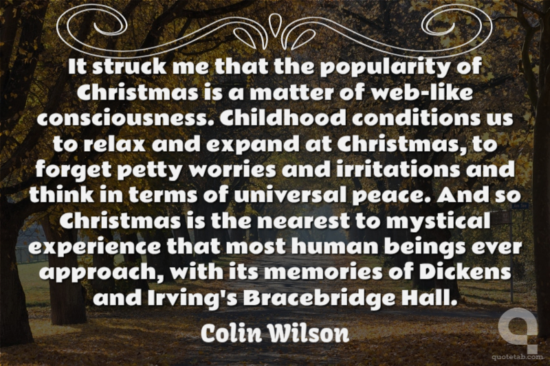 It struck me that the popularity of Christmas is a matter of web-like consciousness. Childhood conditions us to relax and expand at Christmas, to forget petty worries and irritations and think in terms of universal peace. And so Christmas is the nearest to mystical experience that most human beings ever approach, with its memories of Dickens and Irving's Bracebridge Hall.