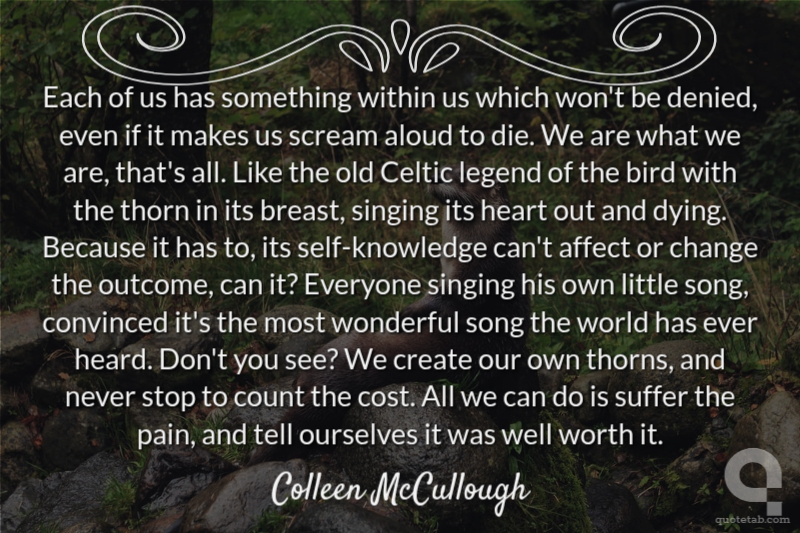 Each of us has something within us which won't be denied, even if it makes us scream aloud to die. We are what we are, that's all. Like the old Celtic legend of the bird with the thorn in its breast, singing its heart out and dying. Because it has to, its self-knowledge can't affect or change the outcome, can it? Everyone singing his own little song, convinced it's the most wonderful song the world has ever heard. Don't you see? We create our own thorns, and never stop to count the cost. All we can do is suffer the pain, and tell ourselves it was well worth it.