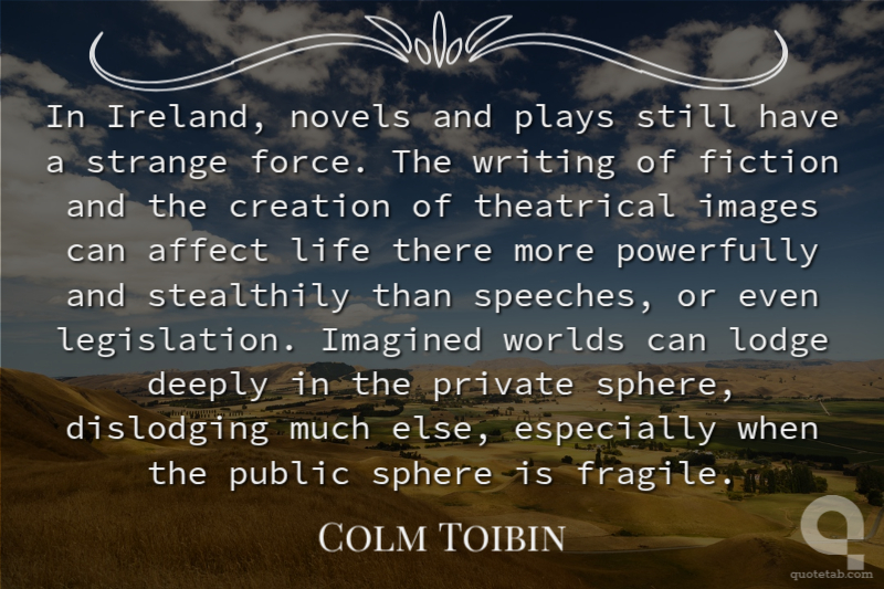 In Ireland, novels and plays still have a strange force. The writing of fiction and the creation of theatrical images can affect life there more powerfully and stealthily than speeches, or even legislation. Imagined worlds can lodge deeply in the private sphere, dislodging much else, especially when the public sphere is fragile.