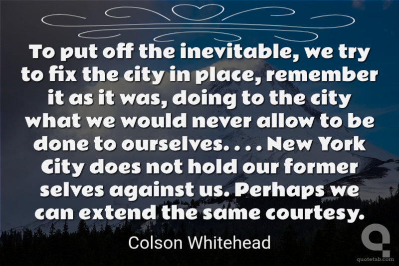 To put off the inevitable, we try to fix the city in place, remember it as it was, doing to the city what we would never allow to be done to ourselves. . . . New York City does not hold our former selves against us. Perhaps we can extend the same courtesy.