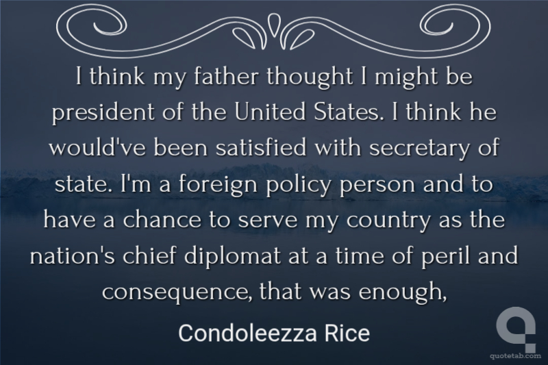 I think my father thought I might be president of the United States. I think he would've been satisfied with secretary of state. I'm a foreign policy person and to have a chance to serve my country as the nation's chief diplomat at a time of peril and consequence, that was enough,