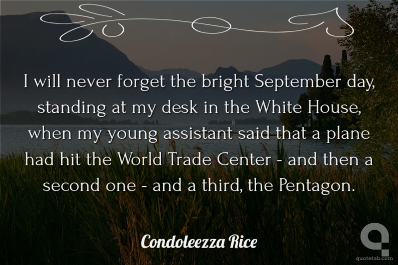 I will never forget the bright September day, standing at my desk in the White House, when my young assistant said that a plane had hit the World Trade Center - and then a second one - and a third, the Pentagon.