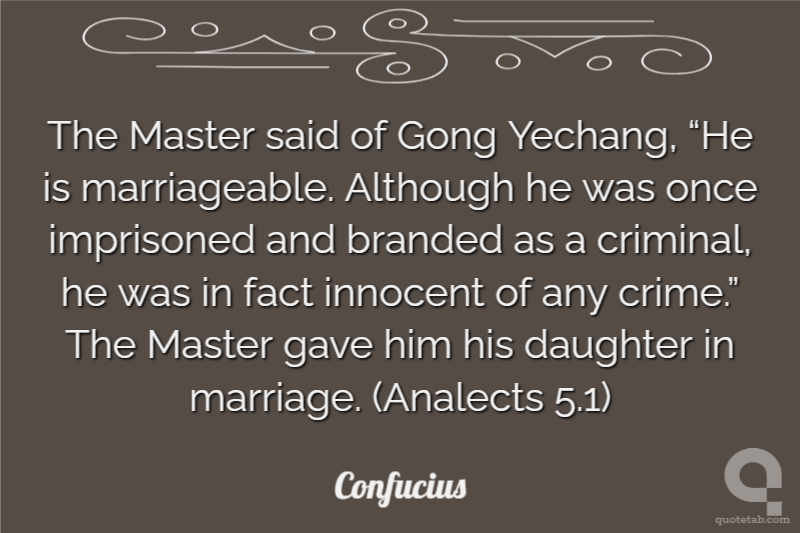 The Master said of Gong Yechang, “He is marriageable. Although he was once imprisoned and branded as a criminal, he was in fact innocent of any crime.” The Master gave him his daughter in marriage. (Analects 5.1)