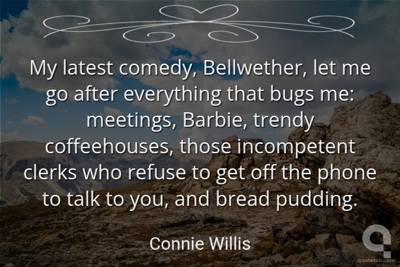 My latest comedy, Bellwether, let me go after everything that bugs me: meetings, Barbie, trendy coffeehouses, those incompetent clerks who refuse to get off the phone to talk to you, and bread pudding.