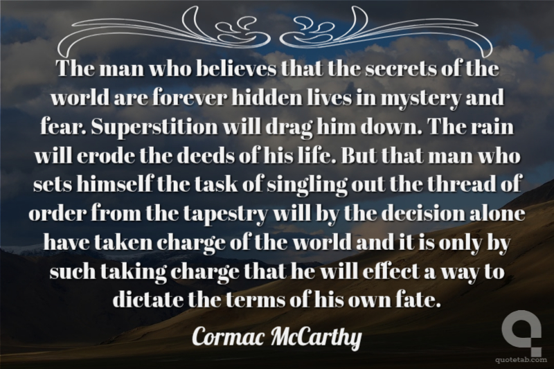 The man who believes that the secrets of the world are forever hidden lives in mystery and fear. Superstition will drag him down. The rain will erode the deeds of his life. But that man who sets himself the task of singling out the thread of order from the tapestry will by the decision alone have taken charge of the world and it is only by such taking charge that he will effect a way to dictate the terms of his own fate.