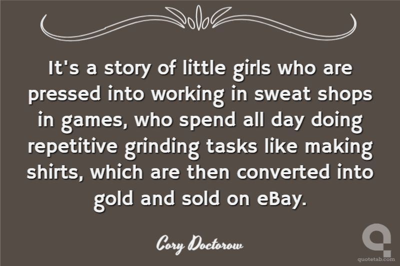 It's a story of little girls who are pressed into working in sweat shops in games, who spend all day doing repetitive grinding tasks like making shirts, which are then converted into gold and sold on eBay.