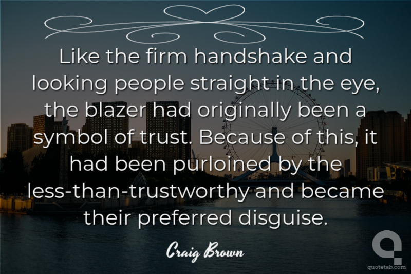 Like the firm handshake and looking people straight in the eye, the blazer had originally been a symbol of trust. Because of this, it had been purloined by the less-than-trustworthy and became their preferred disguise.