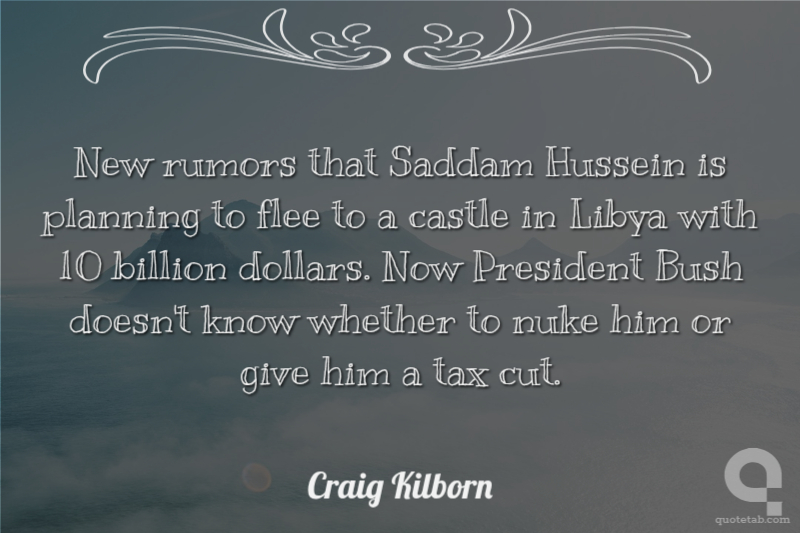 New rumors that Saddam Hussein is planning to flee to a castle in Libya with 10 billion dollars. Now President Bush doesn't know whether to nuke him or give him a tax cut.
