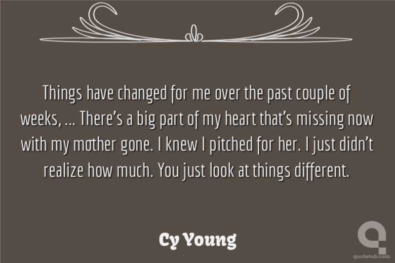 Things have changed for me over the past couple of weeks, ... There's a big part of my heart that's missing now with my mother gone. I knew I pitched for her. I just didn't realize how much. You just look at things different.