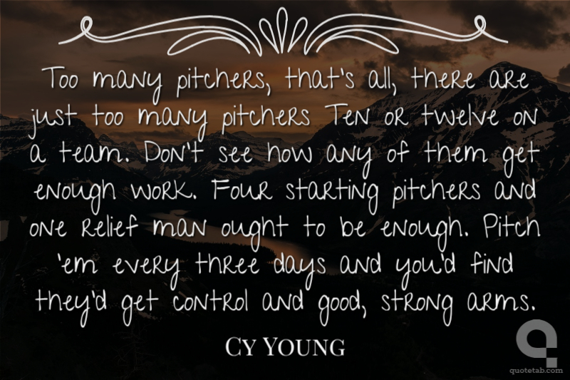 Too many pitchers, that's all, there are just too many pitchers Ten or twelve on a team. Don't see how any of them get enough work. Four starting pitchers and one relief man ought to be enough. Pitch 'em every three days and you'd find they'd get control and good, strong arms.