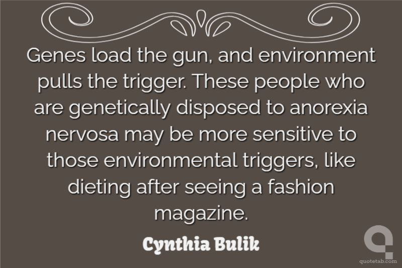 Genes load the gun, and environment pulls the trigger. These people who are genetically disposed to anorexia nervosa may be more sensitive to those environmental triggers, like dieting after seeing a fashion magazine.