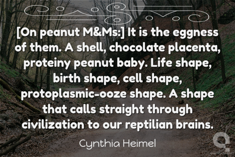 [On peanut M&Ms:] It is the eggness of them. A shell, chocolate placenta, proteiny peanut baby. Life shape, birth shape, cell shape, protoplasmic-ooze shape. A shape that calls straight through civilization to our reptilian brains.