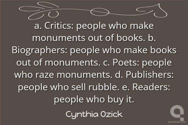 a. Critics: people who make monuments out of books. b. Biographers: people who make books out of monuments. c. Poets: people who raze monuments. d. Publishers: people who sell rubble. e. Readers: people who buy it.