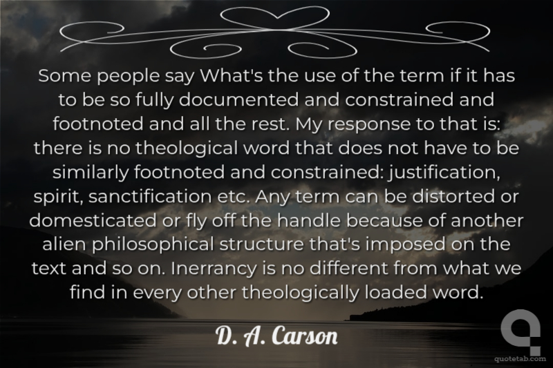 Some people say What's the use of the term if it has to be so fully documented and constrained and footnoted and all the rest. My response to that is: there is no theological word that does not have to be similarly footnoted and constrained: justification, spirit, sanctification etc. Any term can be distorted or domesticated or fly off the handle because of another alien philosophical structure that's imposed on the text and so on. Inerrancy is no different from what we find in every other theologically loaded word.