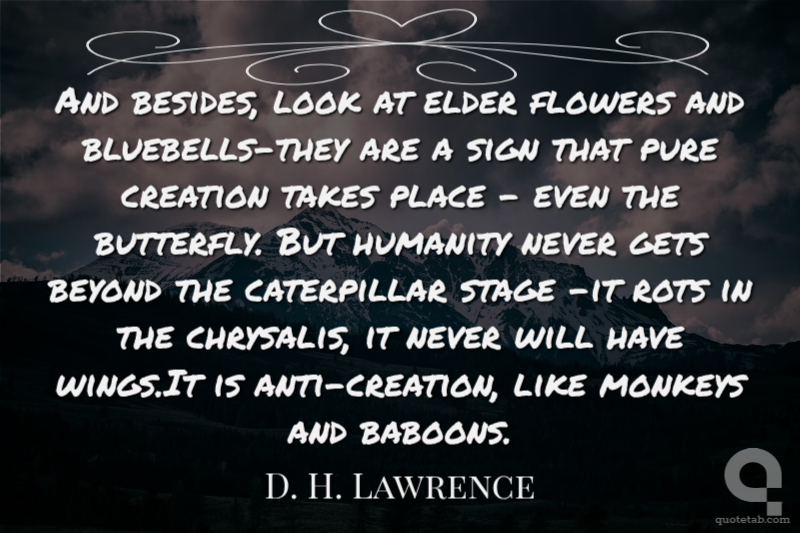 And besides, look at elder flowers and bluebells-they are a sign that pure creation takes place - even the butterfly. But humanity never gets beyond the caterpillar stage -it rots in the chrysalis, it never will have wings.It is anti-creation, like monkeys and baboons.