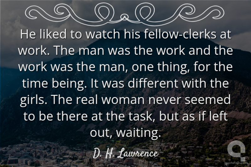 He liked to watch his fellow-clerks at work. The man was the work and the work was the man, one thing, for the time being. It was different with the girls. The real woman never seemed to be there at the task, but as if left out, waiting.