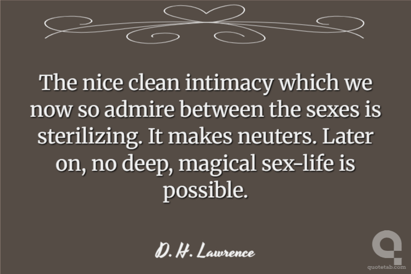 The nice clean intimacy which we now so admire between the sexes is sterilizing. It makes neuters. Later on, no deep, magical sex-life is possible.