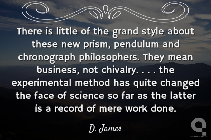 There is little of the grand style about these new prism, pendulum and chronograph philosophers. They mean business, not chivalry. . . . the experimental method has quite changed the face of science so far as the latter is a record of mere work done.