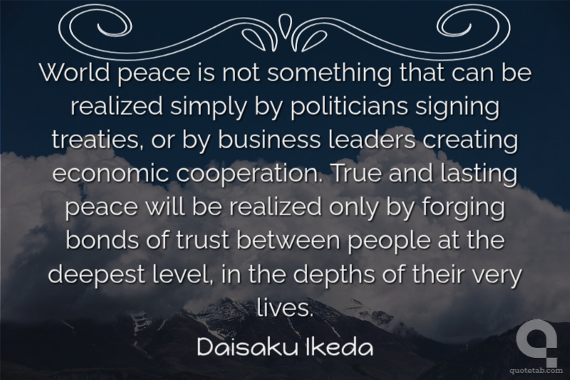 World peace is not something that can be realized simply by politicians signing treaties, or by business leaders creating economic cooperation. True and lasting peace will be realized only by forging bonds of trust between people at the deepest level, in the depths of their very lives.