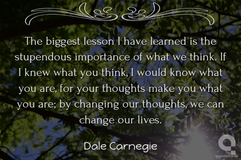 The biggest lesson I have learned is the stupendous importance of what we think. If I knew what you think, I would know what you are, for your thoughts make you what you are; by changing our thoughts, we can change our lives.