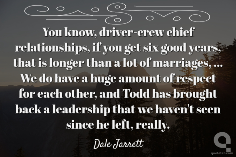 You know, driver-crew chief relationships, if you get six good years, that is longer than a lot of marriages, ... We do have a huge amount of respect for each other, and Todd has brought back a leadership that we haven't seen since he left, really.