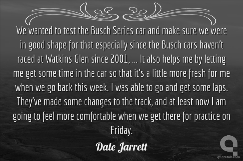 We wanted to test the Busch Series car and make sure we were in good shape for that especially since the Busch cars haven't raced at Watkins Glen since 2001, ... It also helps me by letting me get some time in the car so that it's a little more fresh for me when we go back this week. I was able to go and get some laps. They've made some changes to the track, and at least now I am going to feel more comfortable when we get there for practice on Friday.