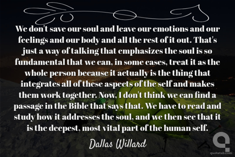 We don't save our soul and leave our emotions and our feelings and our body and all the rest of it out. That's just a way of talking that emphasizes the soul is so fundamental that we can, in some cases, treat it as the whole person because it actually is the thing that integrates all of these aspects of the self and makes them work together. Now, I don't think we can find a passage in the Bible that says that. We have to read and study how it addresses the soul, and we then see that it is the deepest, most vital part of the human self.