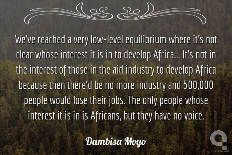 We've reached a very low-level equilibrium where it's not clear whose interest it is in to develop Africa... It's not in the interest of those in the aid industry to develop Africa because then there'd be no more industry and 500,000 people would lose their jobs. The only people whose interest it is in is Africans, but they have no voice.