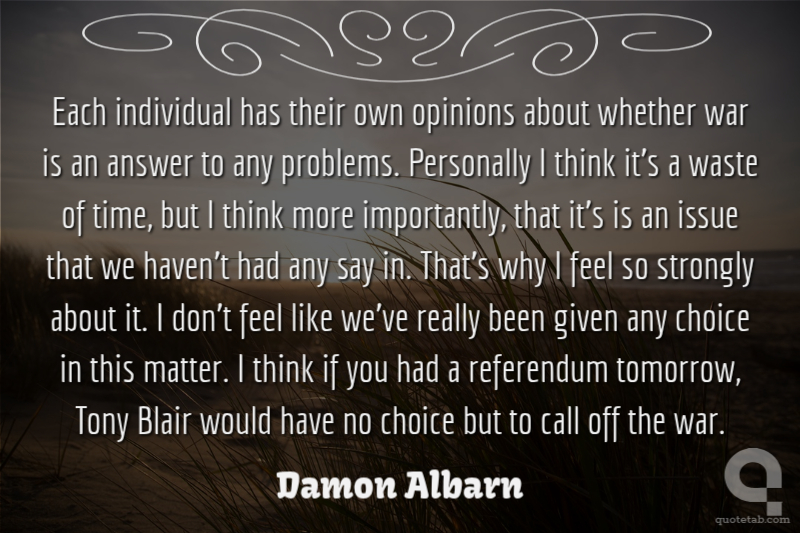 Each individual has their own opinions about whether war is an answer to any problems. Personally I think it's a waste of time, but I think more importantly, that it's is an issue that we haven't had any say in. That's why I feel so strongly about it. I don't feel like we've really been given any choice in this matter. I think if you had a referendum tomorrow, Tony Blair would have no choice but to call off the war.