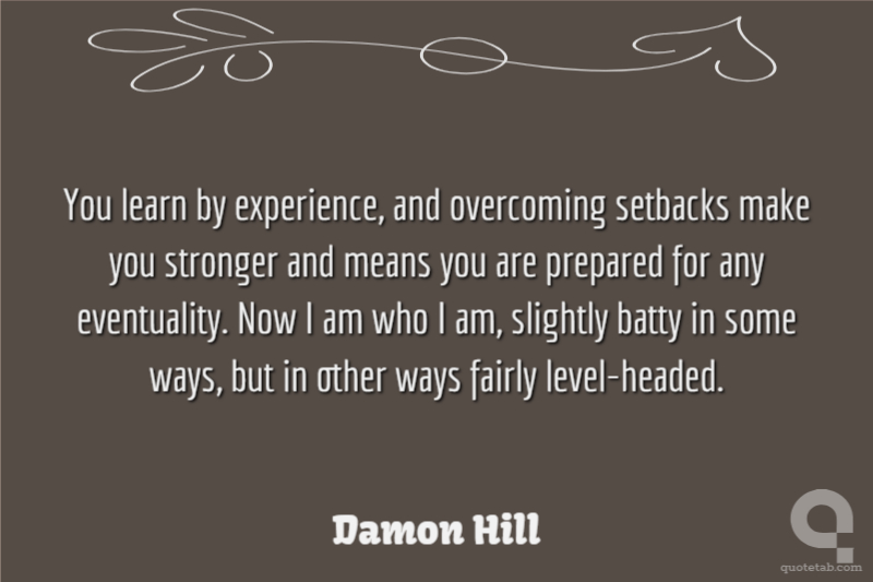You learn by experience, and overcoming setbacks make you stronger and means you are prepared for any eventuality. Now I am who I am, slightly batty in some ways, but in other ways fairly level-headed.