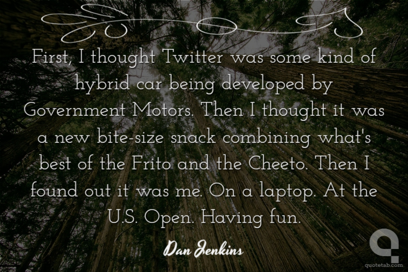 First, I thought Twitter was some kind of hybrid car being developed by Government Motors. Then I thought it was a new bite-size snack combining what's best of the Frito and the Cheeto. Then I found out it was me. On a laptop. At the U.S. Open. Having fun.