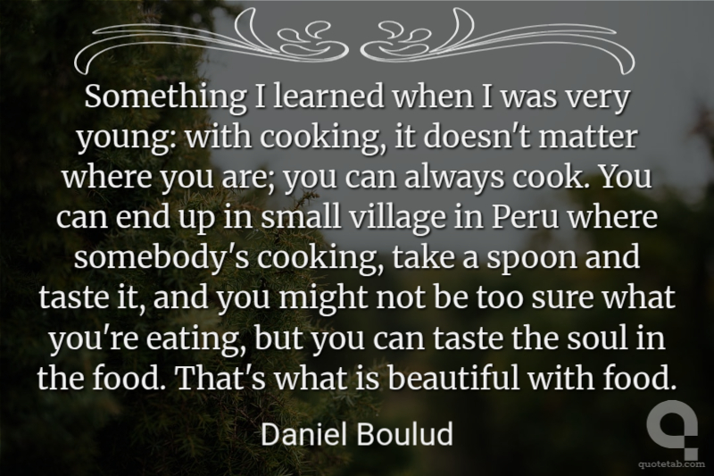 Something I learned when I was very young: with cooking, it doesn't matter where you are; you can always cook. You can end up in small village in Peru where somebody's cooking, take a spoon and taste it, and you might not be too sure what you're eating, but you can taste the soul in the food. That's what is beautiful with food.