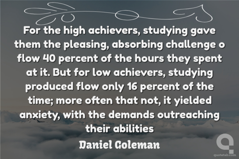 For the high achievers, studying gave them the pleasing, absorbing challenge o flow 40 percent of the hours they spent at it. But for low achievers, studying produced flow only 16 percent of the time; more often that not, it yielded anxiety, with the demands outreaching their abilities