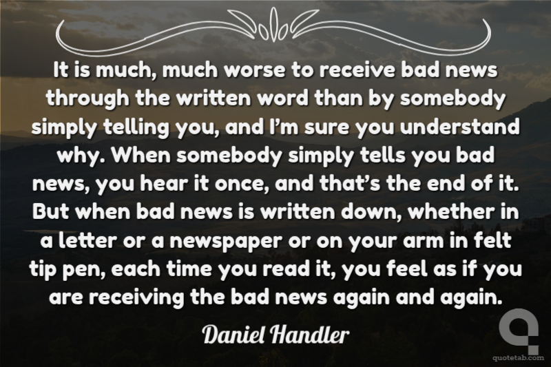 It is much, much worse to receive bad news through the written word than by somebody simply telling you, and I’m sure you understand why. When somebody simply tells you bad news, you hear it once, and that’s the end of it. But when bad news is written down, whether in a letter or a newspaper or on your arm in felt tip pen, each time you read it, you feel as if you are receiving the bad news again and again.