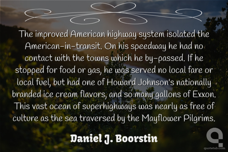 The improved American highway system isolated the American-in-transit. On his speedway he had no contact with the towns which he by-passed. If he stopped for food or gas, he was served no local fare or local fuel, but had one of Howard Johnson's nationally branded ice cream flavors, and so many gallons of Exxon. This vast ocean of superhighways was nearly as free of culture as the sea traversed by the Mayflower Pilgrims.