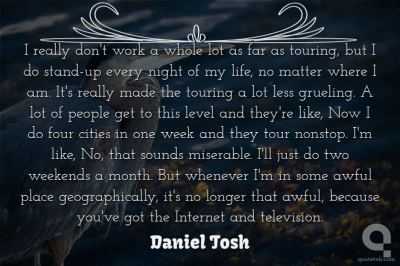 I really don't work a whole lot as far as touring, but I do stand-up every night of my life, no matter where I am. It's really made the touring a lot less grueling. A lot of people get to this level and they're like, Now I do four cities in one week and they tour nonstop. I'm like, No, that sounds miserable. I'll just do two weekends a month. But whenever I'm in some awful place geographically, it's no longer that awful, because you've got the Internet and television.